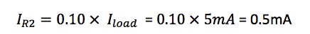 Let’s talk a moment about how to decide the resistor values you will need for your voltage divider.  To do so, you must take into account the load that will be connected to the output of the voltage divider.  Let’s assume our load is 1KΩ and requires 5V at 5mA.  We now apply the “10% Rule” so that the “bleeder current” through R2 is 10% of the current that we want to follow though the load.  In this case:
