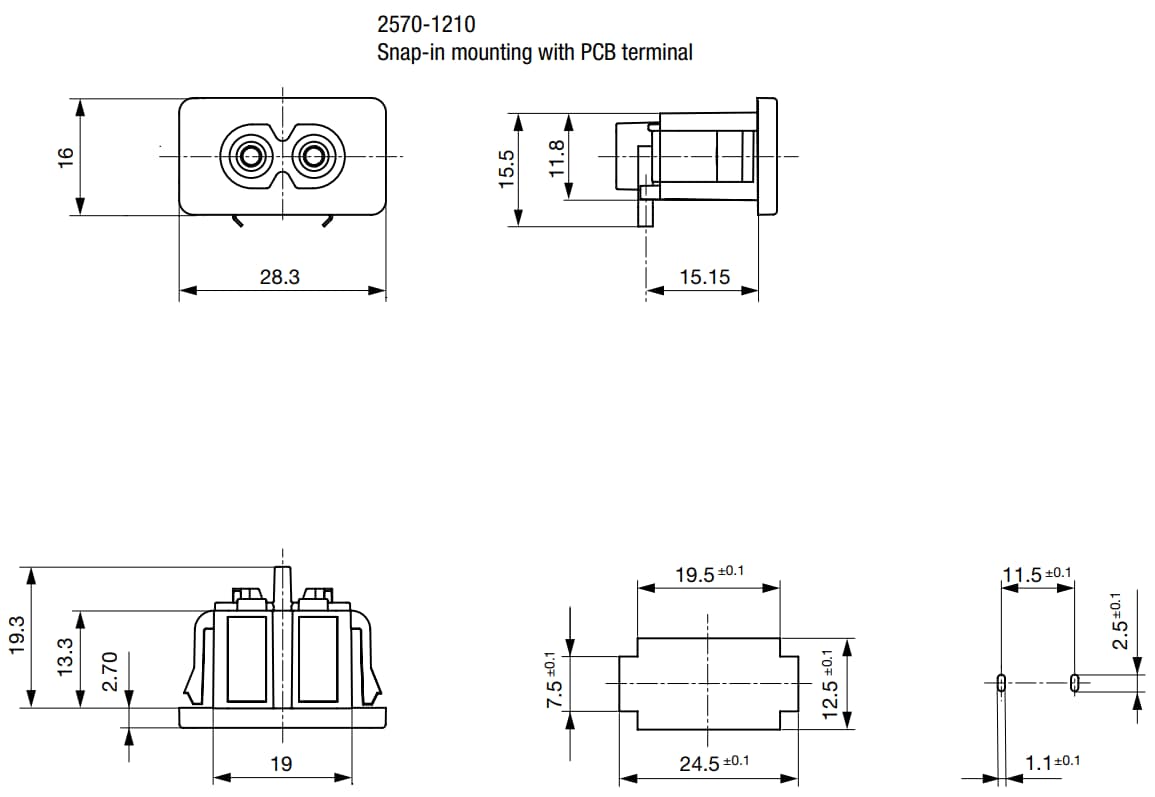 Schurter 2570 IEC Appliance Terminals are designed to allow connections to the equipment circuitry using a separate detachable AC line cord. These Schurter terminals have a high-quality Polyamide 6 (PA6) housing which has a flammability rating of UL 94V-0. The 2570 terminals have an operating temperature range of -25°C to +70°C, a panel thickness of 0.6mm to 2mm for snap-in, and 1.5mm for split-panel. These terminals are available in inlet C8 solder, quick connect, and PCB variants and are suitable for appliances with protection class II.Features