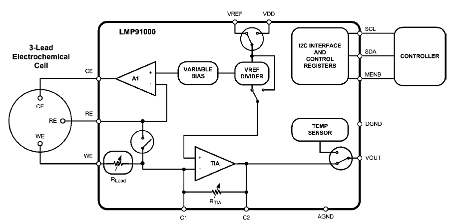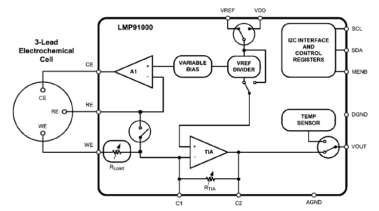The LMP91000 is a programmable Analog Front End ( AFE) for use in micro-power electrochemical sensing applications that provides a complete signal path solution between a sensor and a microcontroller that generates an output voltage proportional to the cell current. The LMP91000 's programmability enables it to support multiple electrochemical sensors such as 3-lead toxic gas sensors and 2-lead galvanic cell sensors with a single design, as opposed to the multiple discrete solutions. The LMP91000 supports gas sensitivities over a range of 0.5 nA/ppm to 9500 nA/ppm and also allows for an easy conversion of current ranges from 5µA to 750µA full scale. Its adjustable cell bias and transimpedance amplifier ( TIA ) gain are programmable through the I 2 C interface. The LMP91000 is optimized for micro-power applications and operates over a voltage range of 2.7V to 5.25V.