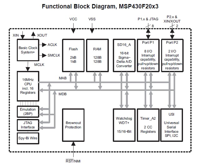 The MSP430F20xx series is an ultra-low-power mixed signal microcontroller with a built-in 16-bit timer and 10 I/0 pins. The MSP430F2003 has built-in communication capability using synchronous protocols (SPI or I2C ) and a 16-bit sigma-delta A/D converter.