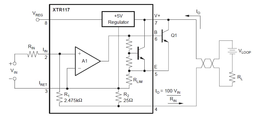 The XTR117 from Texas Instruments is a precision current output converter designed to transmit analog 4-20mA signals over an industry-standard current loop. It provides accurate current scaling and output current limit functions. The XTR117 is a fundamental building block of smart sensors using 4-20mA current transmission. The XTR117 is specified for operation over the extended industrial temperature range -40ºC to +125ºC.